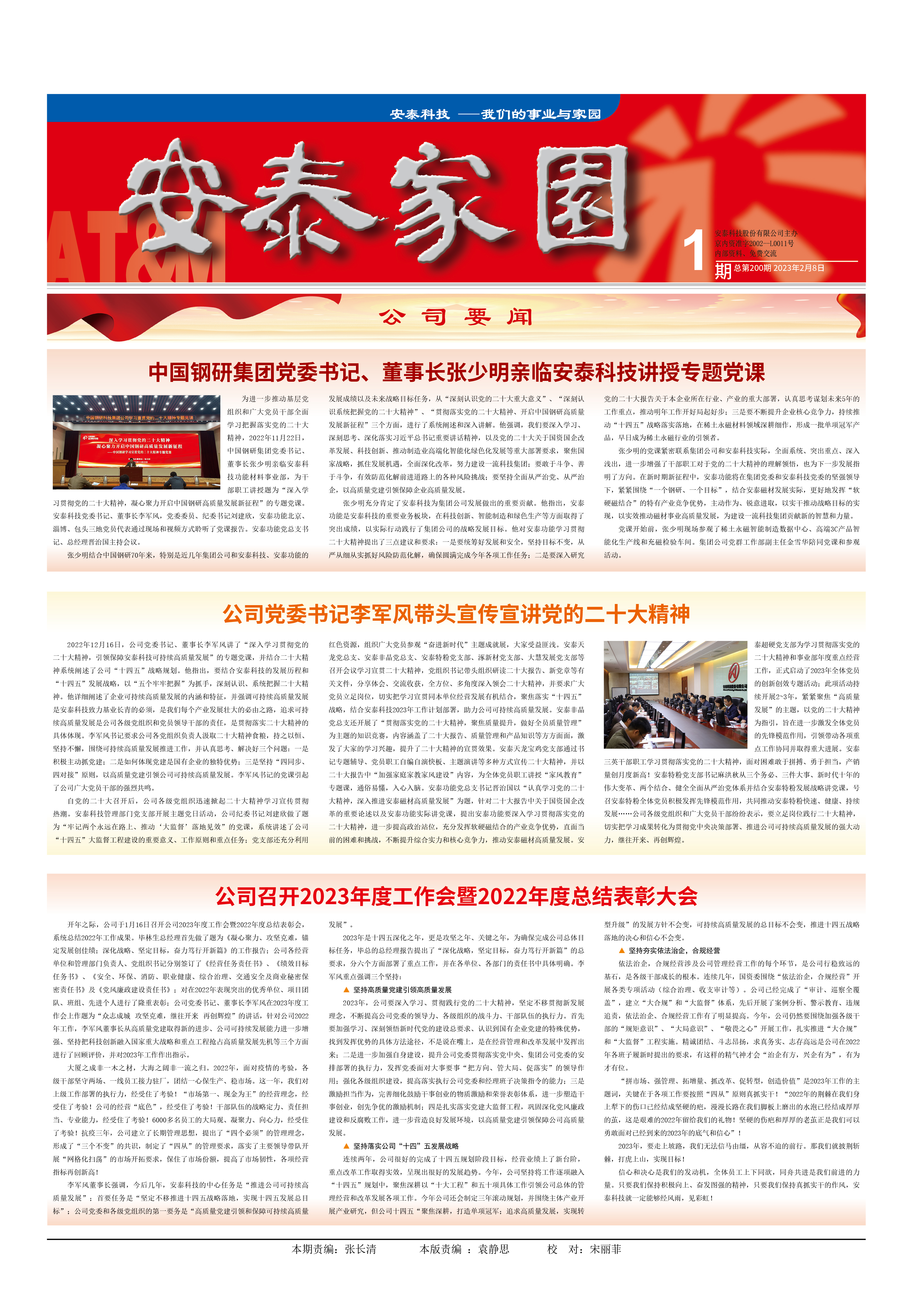 張少明結合中國鋼研70年來,特別是近幾年集團公司和安泰科技、安泰功能的發展成績以及未來戰略目標任務,從“深刻認識黨的二十大重大意義”、“深刻認識系統把握黨的二十大精神”、“貫徹落實黨的二十大精神、開啟中國鋼研高質量發展新征程”三個方面,進行了系統闡述和深入講解。他強調,我們要深入學習、深刻思考、深化落實習近平總書記重要講話精神,以及黨的二十大關于國資國企改革發展、科技創新、推動制造業高端化智能化綠色化發展等重大部署要求,聚焦國家戰略,抓住發展機遇,全面深化改革,努力建設一流科技集團;要敢于斗爭、善于斗爭,有效防范化解前進道路上的各種風險挑戰;要堅持全面從嚴治黨、從嚴治企,以高質量黨建引領保障企業高質量發展。