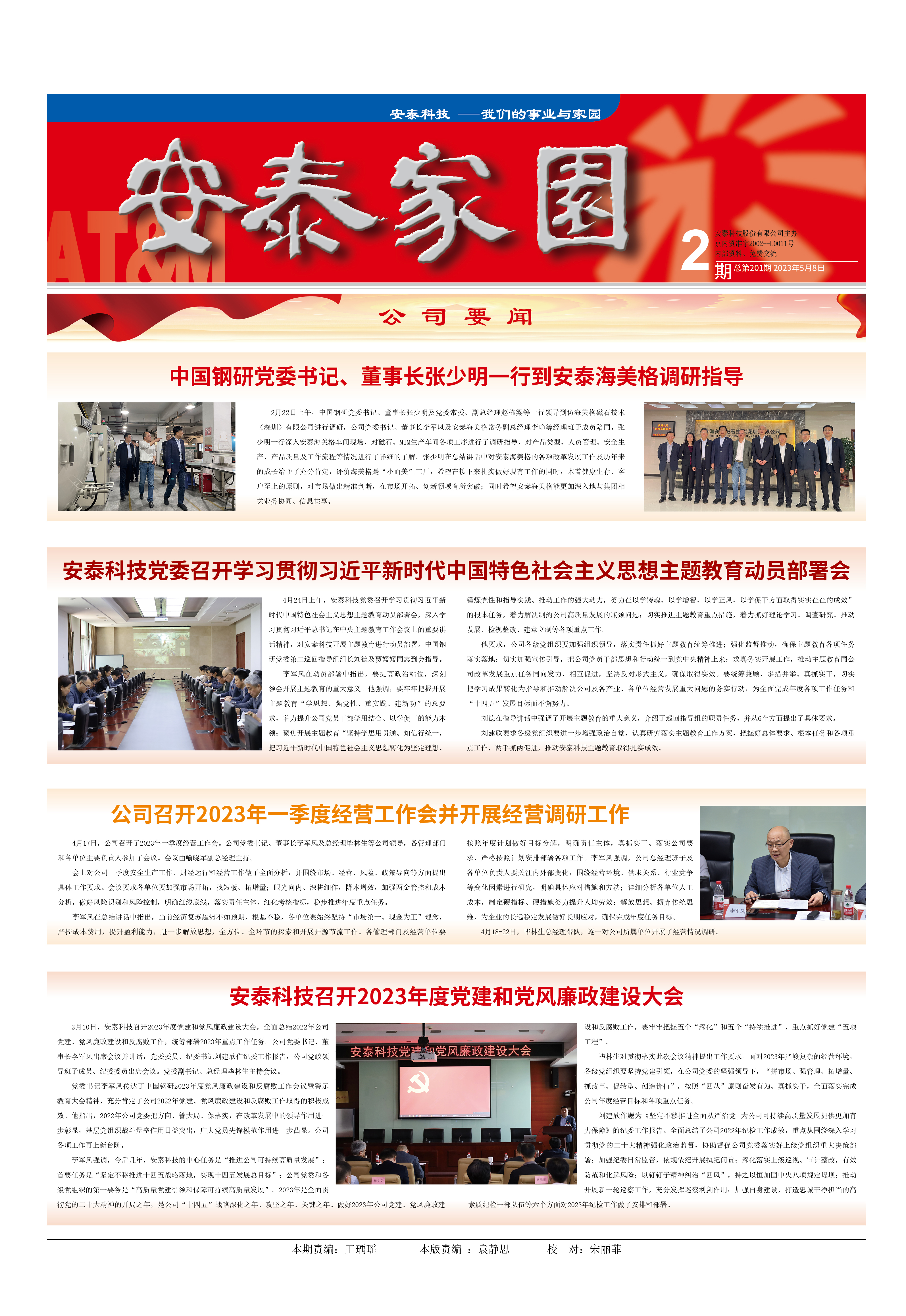 2月22日上午,中國鋼研黨委書記、董事長張少明及黨委常委、副總經理趙棟梁等一行領導到訪海美格磁石技術(深圳)有限公司進行調研,公司黨委書記、董事長李軍風及安泰海美格常務副總經理李崢等經理班子成員陪同。張少明一行深入安泰海美格車間現場,對磁石、MIM生產車間各項工序進行了調研指導,對產品類型、人員管理、安全生產、產品質量及工作流程等情況進行了詳細的了解。張少明在總結講話中對安泰海美格的各項改革發展工作及歷年來的成長給予了充分肯定,評價海美格是“小而美”工廠,希望在接下來扎實做好現有工作的同時,本著健康生存、客戶至上的原則,對市場做出精準判斷,在市場開拓、創新領域有所突破;同時希望安泰海美格能更加深入地與集團相關業務協同、信息共享。