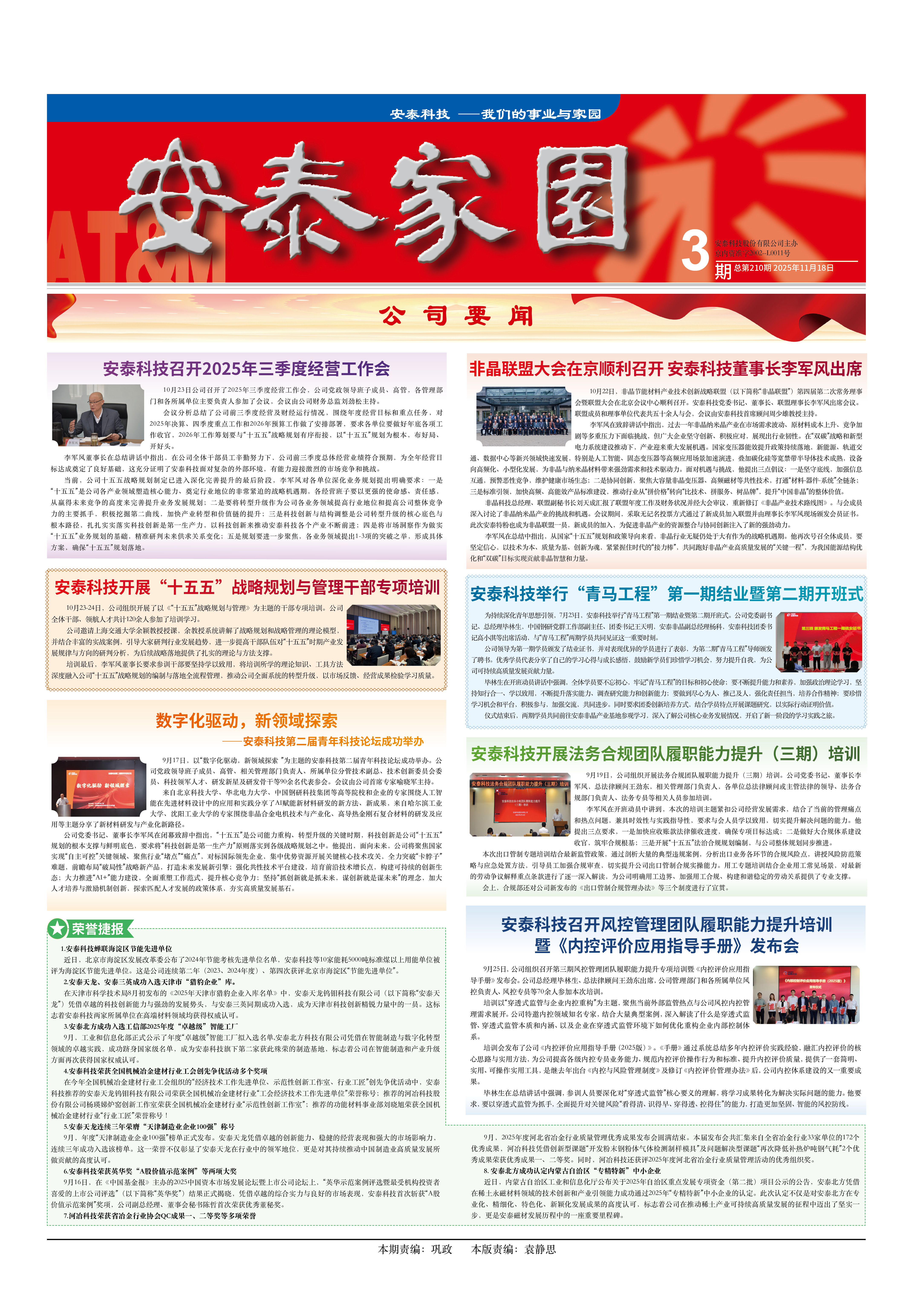 會(huì)議分析總結(jié)了公司前三季度經(jīng)營及財(cái)經(jīng)運(yùn)行情況,圍繞年度經(jīng)營目標(biāo)和重點(diǎn)任務(wù),對2025年決算、四季度重點(diǎn)工作和2026年預(yù)算工作做了安排部署,要求各單位要做好年底各項(xiàng)工作收官,2026年工作籌劃要與“十五五”戰(zhàn)略規(guī)劃有序銜接,以“十五五”規(guī)劃為根本,布好局、開好頭。